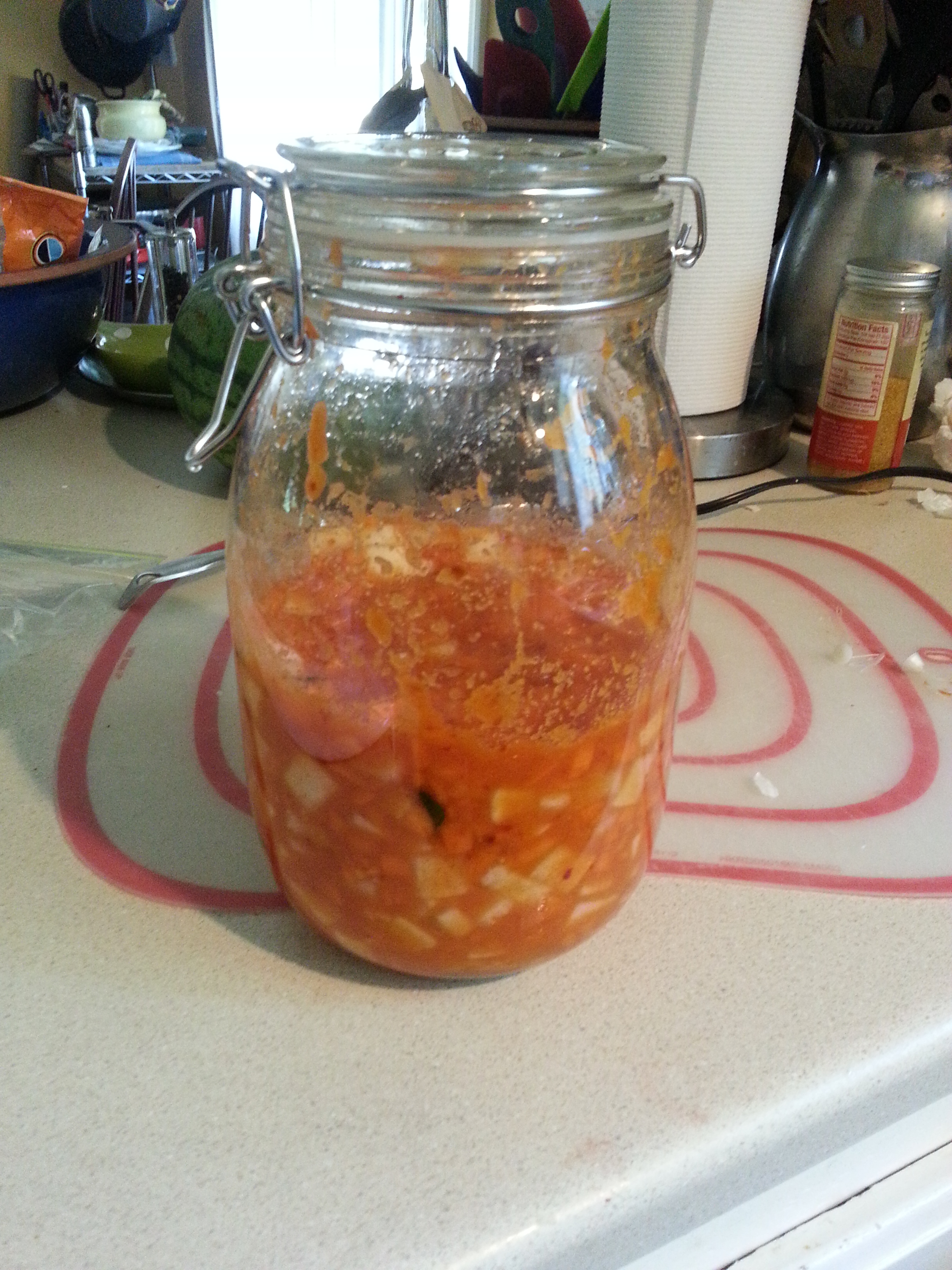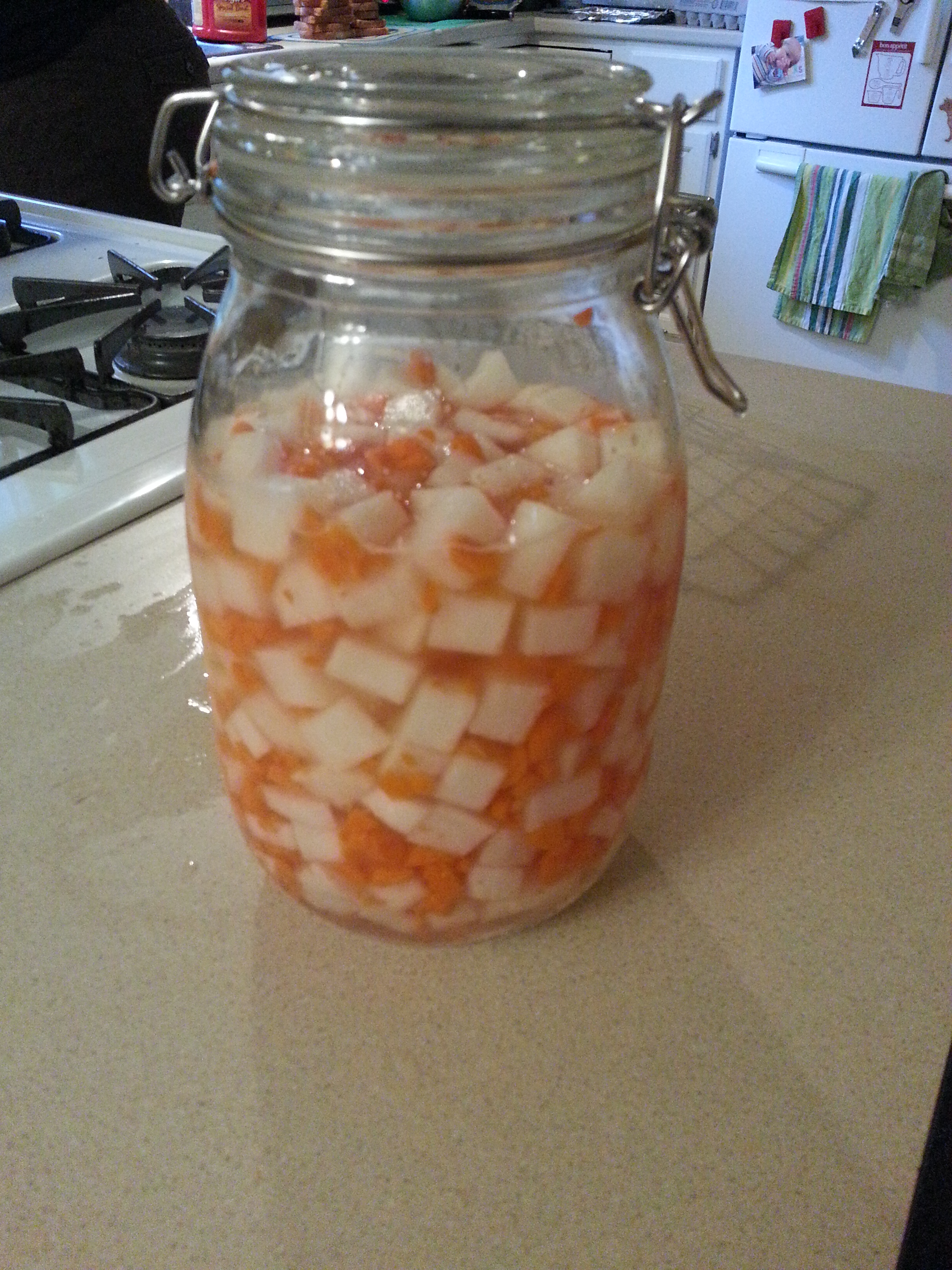 Following the recipe in Real Food Fermentation (http://www.amazon.com/Real-Food-Fermentation-Preserving-Cultures/dp/1592537847/ref=sr_1_1?ie=UTF8&qid=1376239871&sr=8-1&keywords=fermentation+real+food) Though only using 2 pounds of Daikon (1/2 inch cubes) and three handfuls of baby carrots cut into small pieces (smaller than 1/2 cubes)