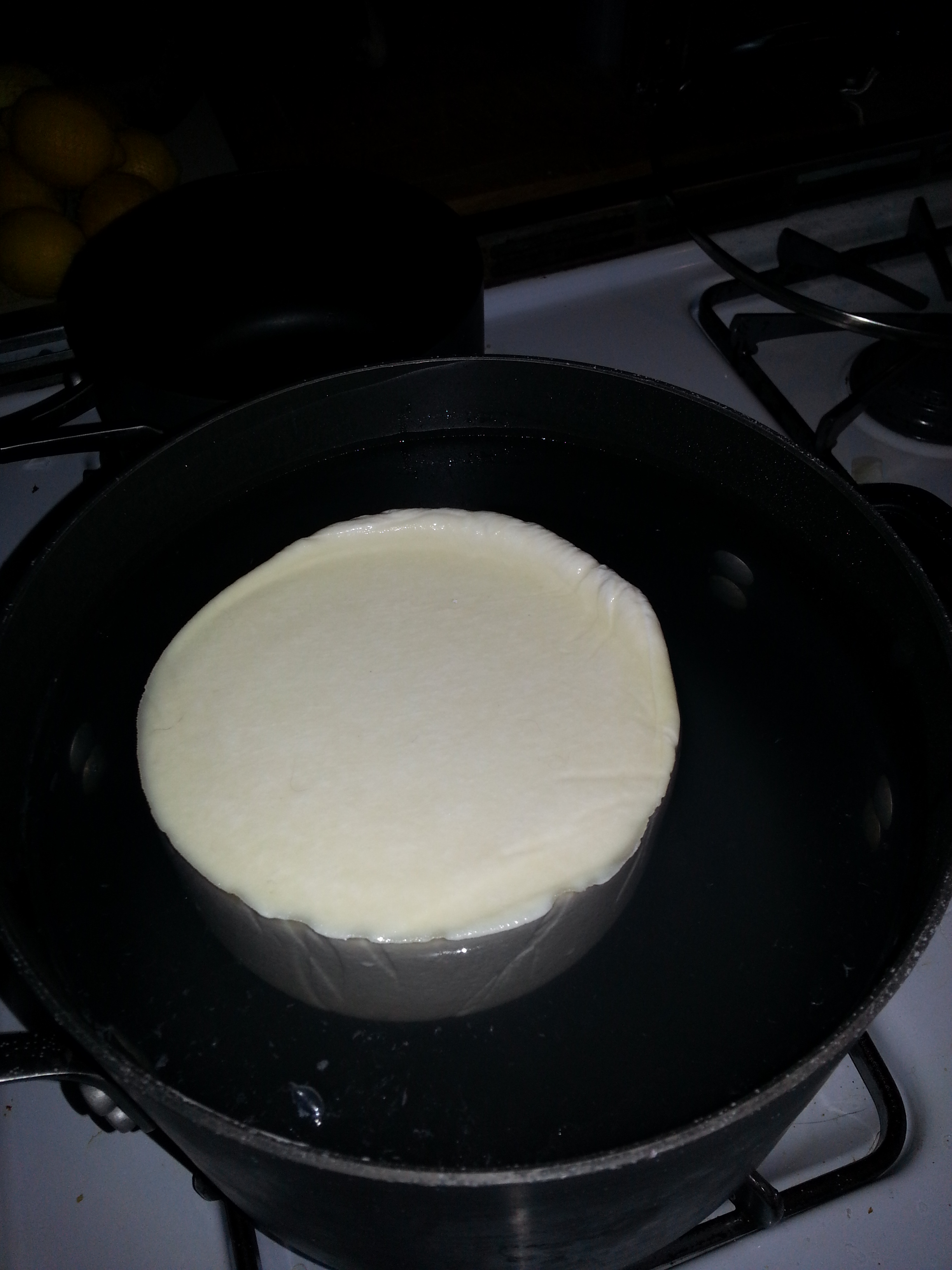 So the cheese looks pretty good this morning after its long night in the press. And the brine (left over from last time, reboiled, skimmed, a little salt added) got to rest all night waiting for the cheese. Ideally the cheese should brine in 55 degrees, but there’s no place my house cool enough(and warm enough)* for that, so we’ll see how it goes.