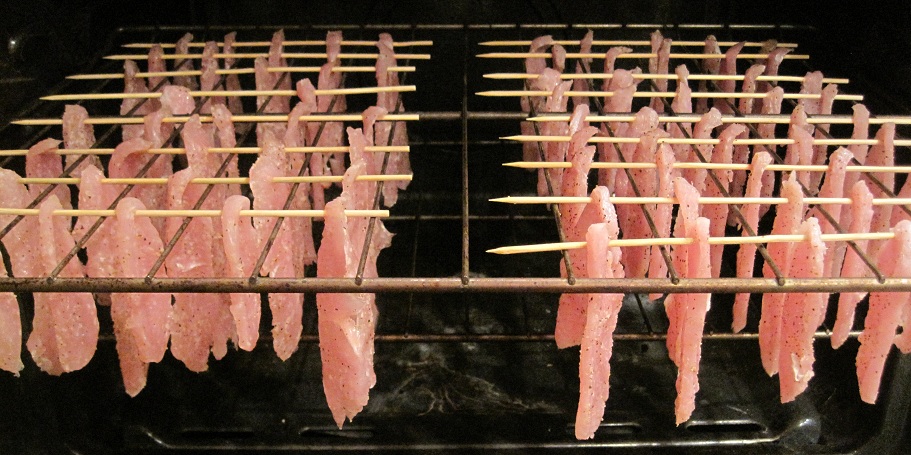 I decided I wanted to try making turkey jerky for the first time, so I looked up some recipes. A lot of them called for marinating overnight, and I didn’t want to wait that long. Then I found this recipe and decided to give it a shot. The final product was quite good, though it didn’t taste like Thanksgiving to me since I used a few different spices.