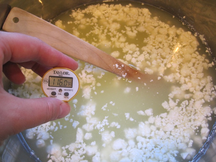 Now, the exciting drama of very slow heating. The goal is to heat the curds slowly at first — 1º every two minutes. Eventually you want it to get to 116º at around the 45-minute mark. I tried not to stress about it too much, just set a countdown timer for 45 minutes and got a feel for whether it was heating too quickly or slowly to hit the desired temperature as time went on. The curds changed in appearance as they cooked, pulling apart and showing more whey between them: