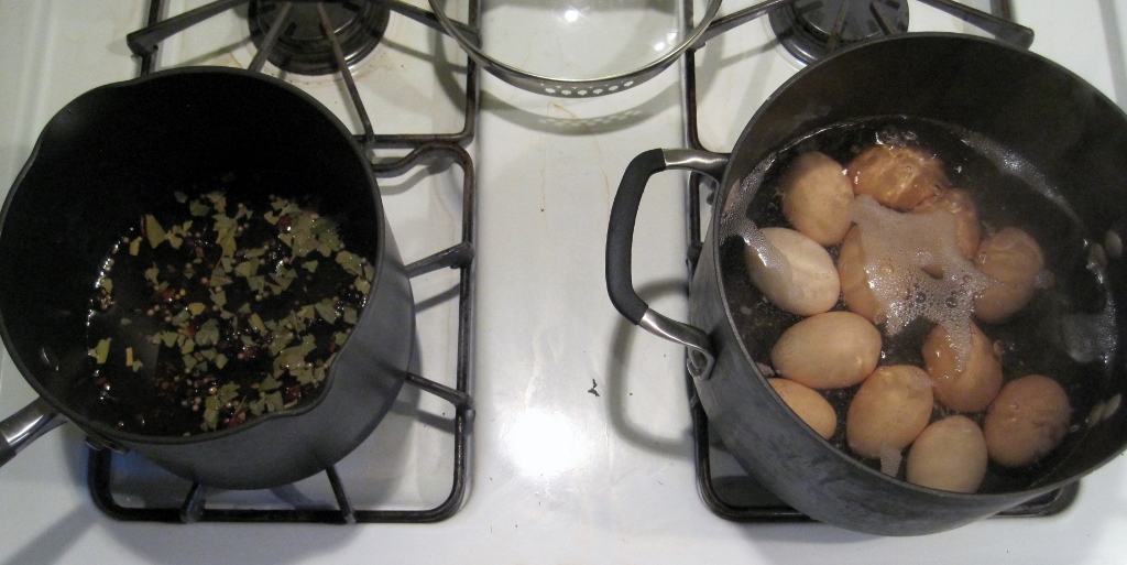 While that is happening, hard-boil the eggs however you like. For me, I start with the eggs in a pot with cool water, then bring them to a boil over medium-high heat, boil for 6 minutes, then put into ice water until cool. Also during this time, put the vinegar, sugar, pickling spices, and peppercorns in a small pot and boil until the sugar is dissolved.