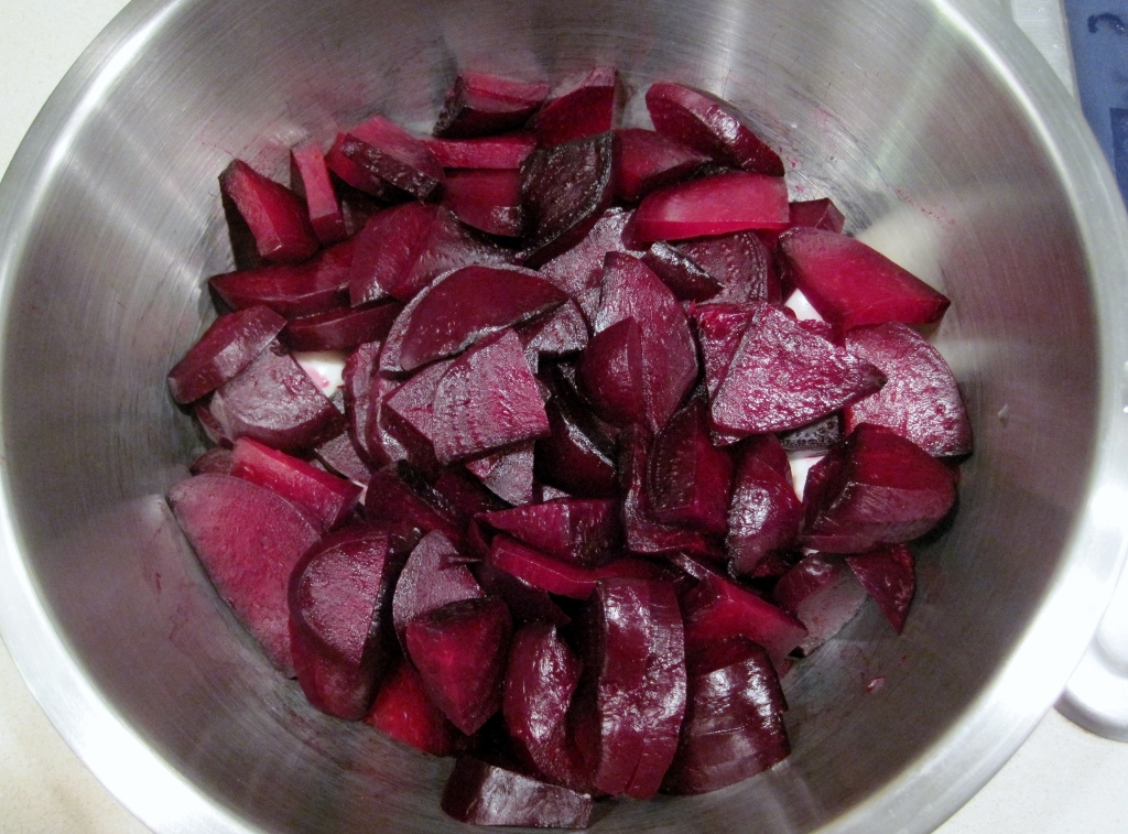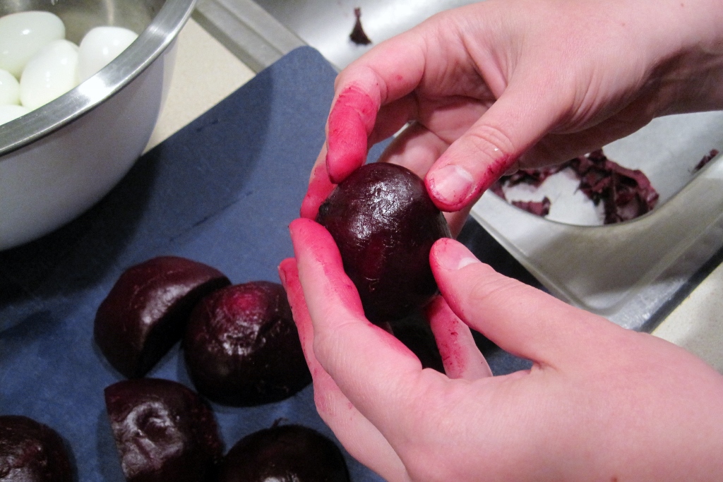 Peel the eggs and put into a large mixing bowl. When the beets are done and cool, peel them as well. Peeling beets is always fun.