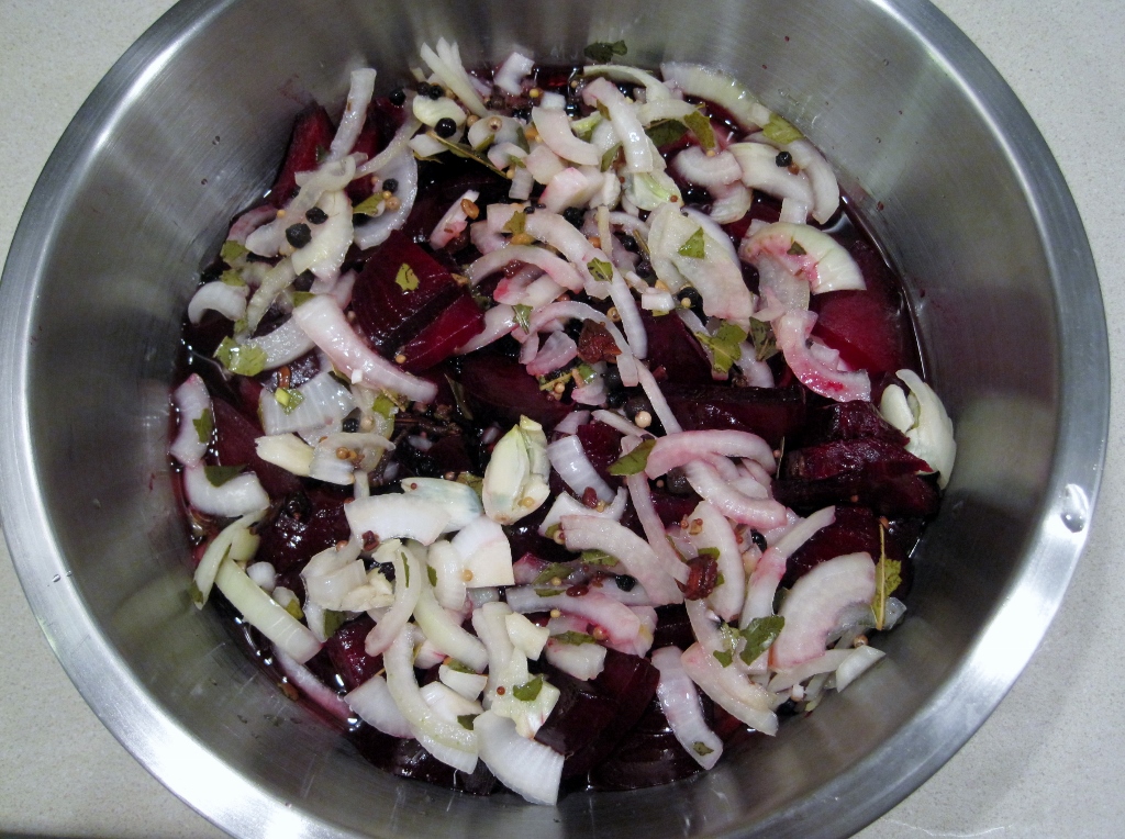 The afternoon of that day, they are ready for eating. The longer you keep them in the liquid, the stronger they will taste. I imagine they should be eaten within a week, since the preservative pickling action doesn’t really penetrate to the center of the egg. They look prettiest when sliced thinly and fanned on a plate with a side of beets and onions (which are also quite tasty).
