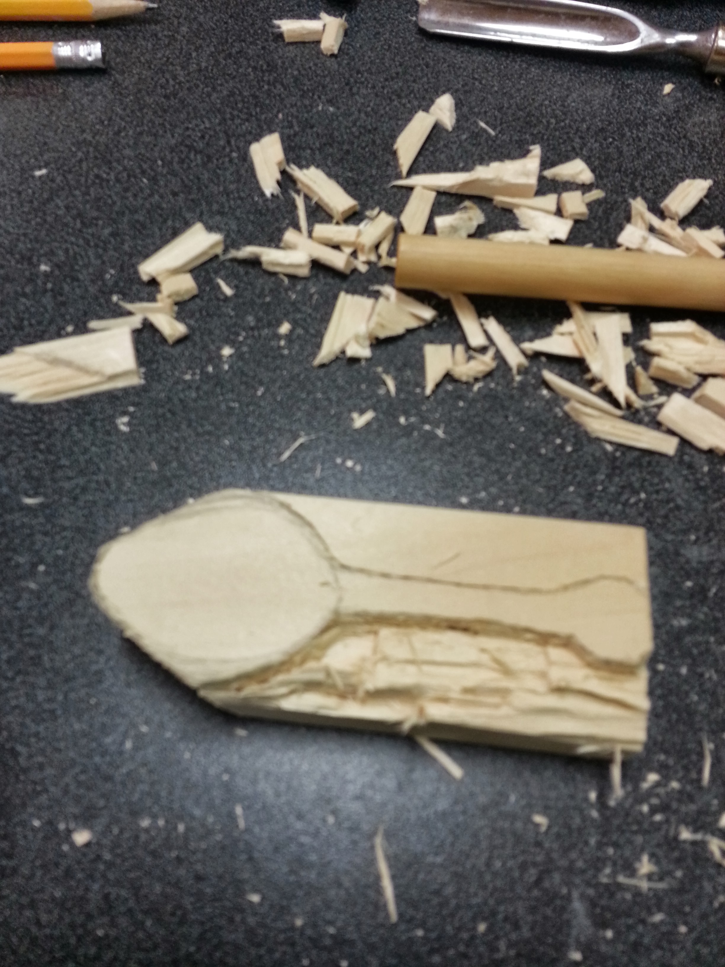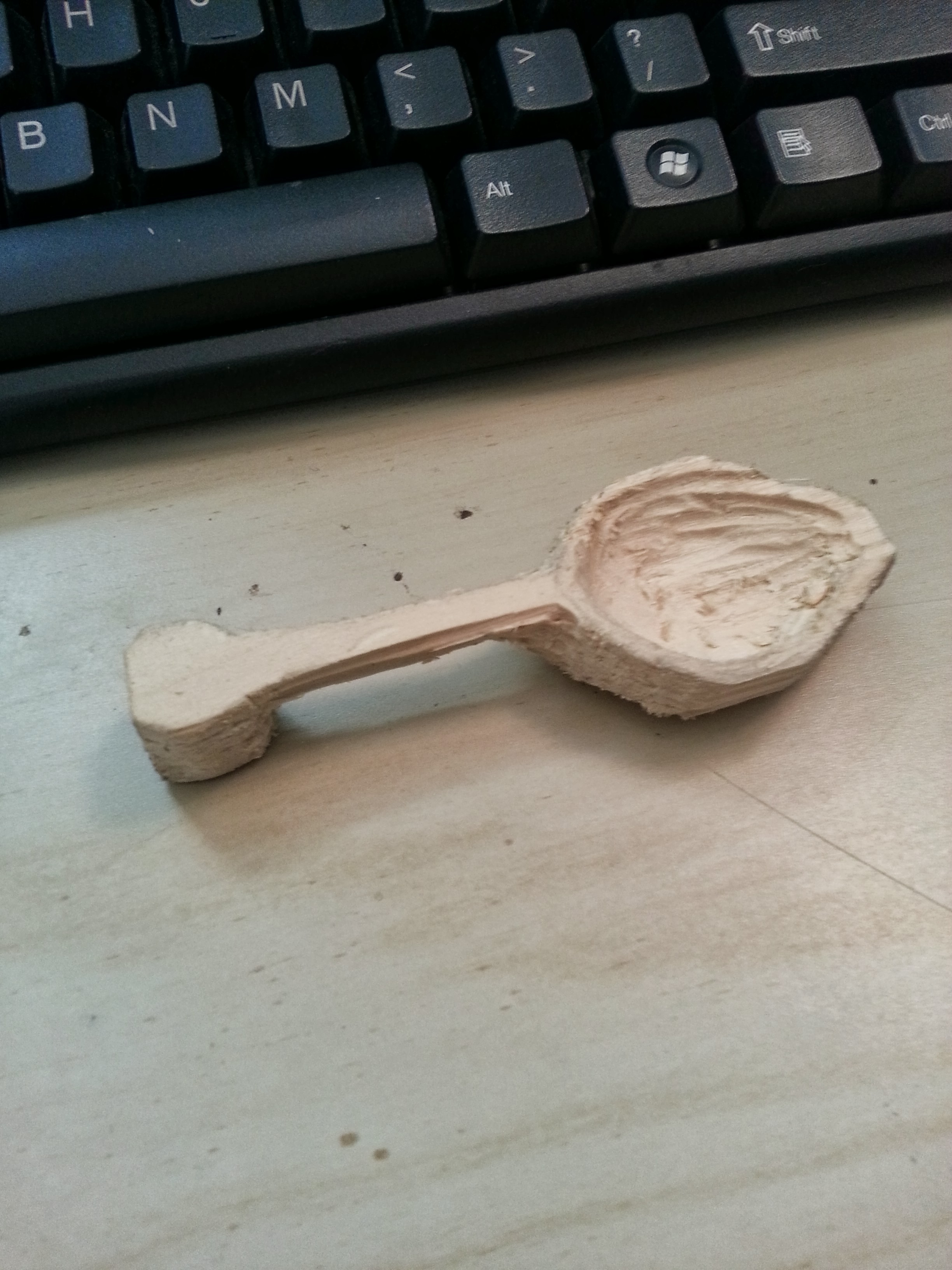 So last week in pewter class I tried to make a sculpy spoon, but it broke in a few places when it came out of the oven. So this week I started to whittle a spoon from a piece of basswood. It’s coming along, it really needs a lot of sanding currently, then perhaps some more carving. I also need a gouge of a slightly different shape, but I think I have one in my kit.