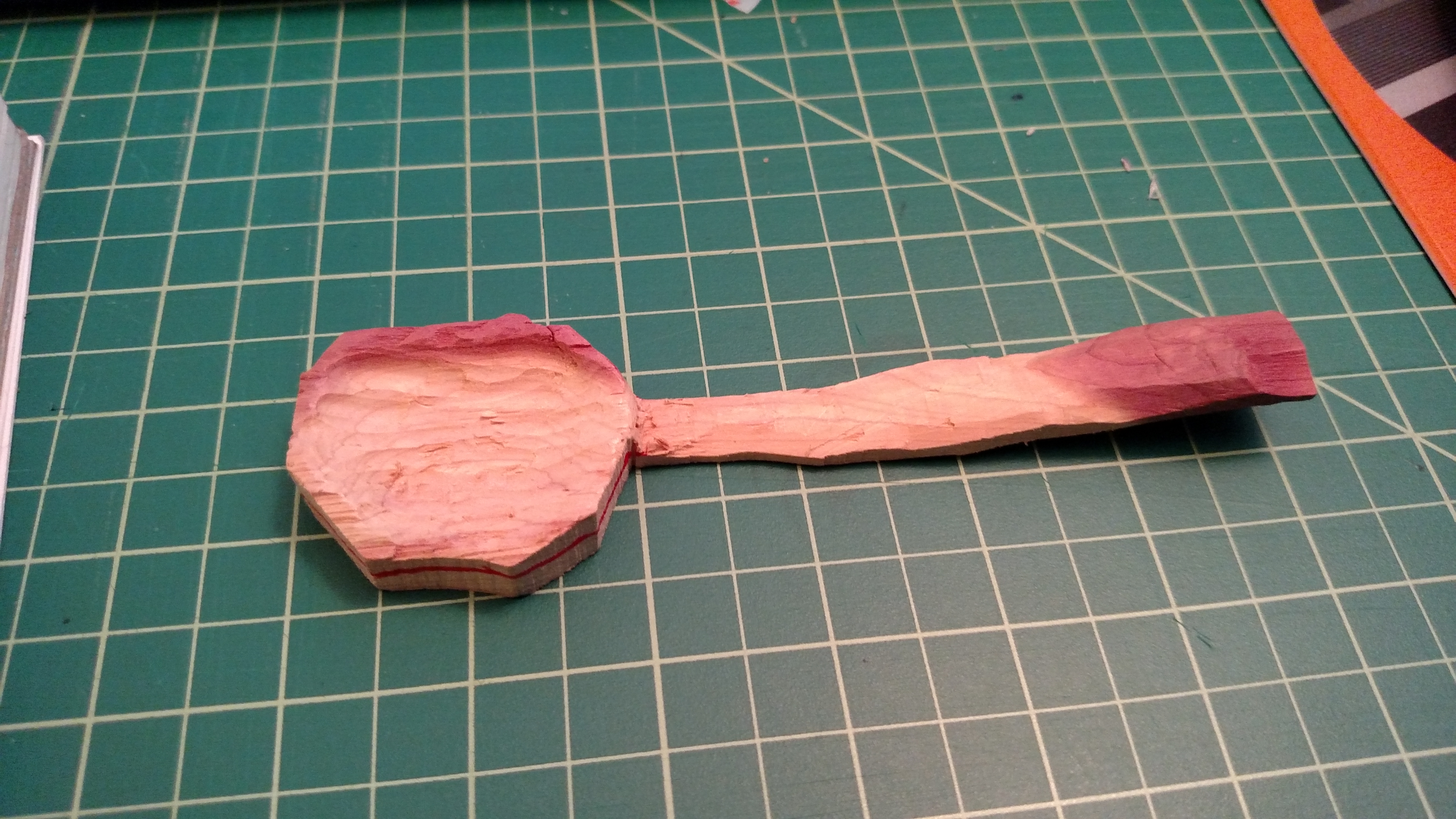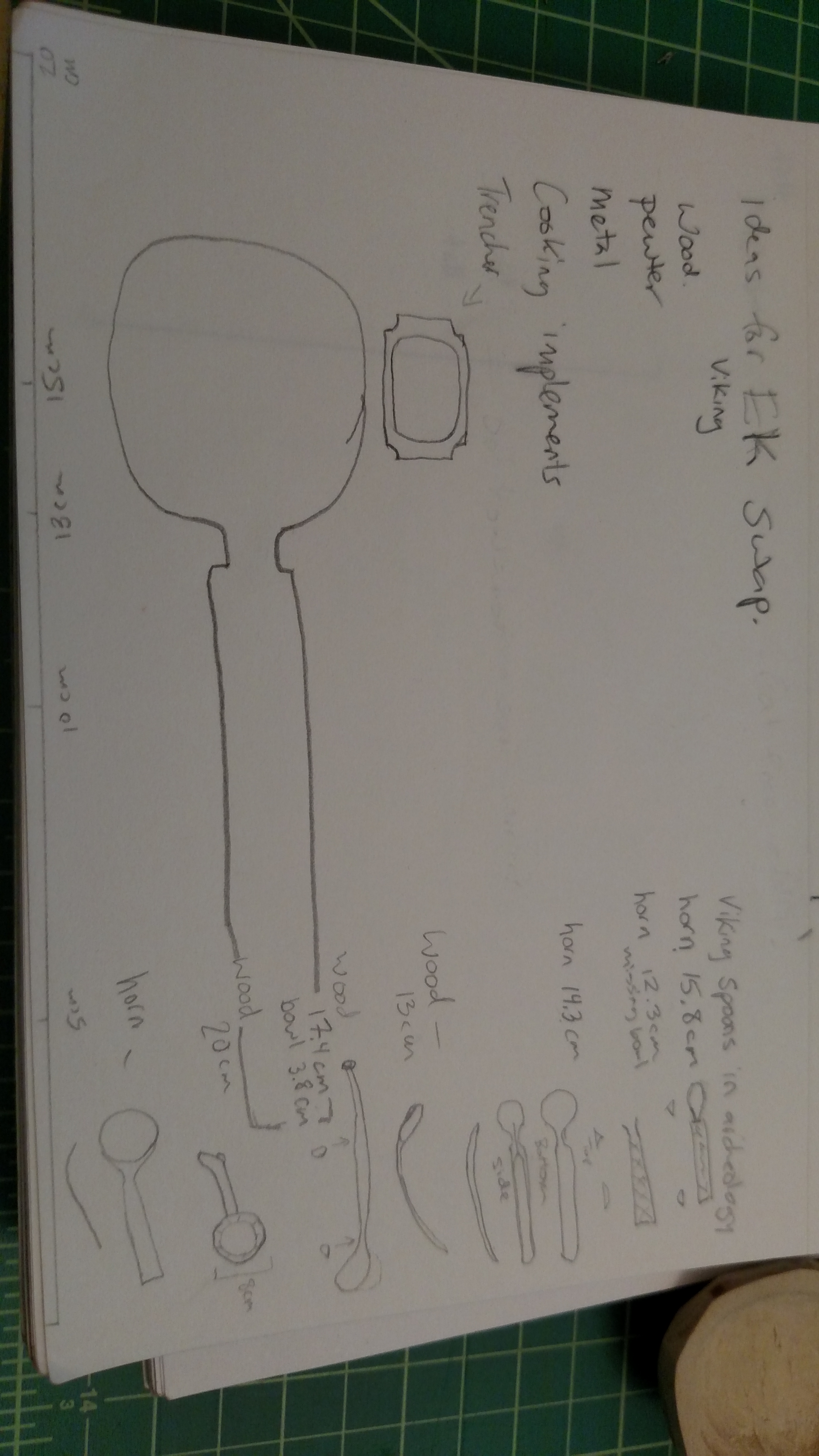 I then took a survey of the extant spoons I had found and figured out the average size of an eating spoon, the average length worked out to around 16 cm, with a wide bowl, narrow handle, ending with a perpendicular squared off end.