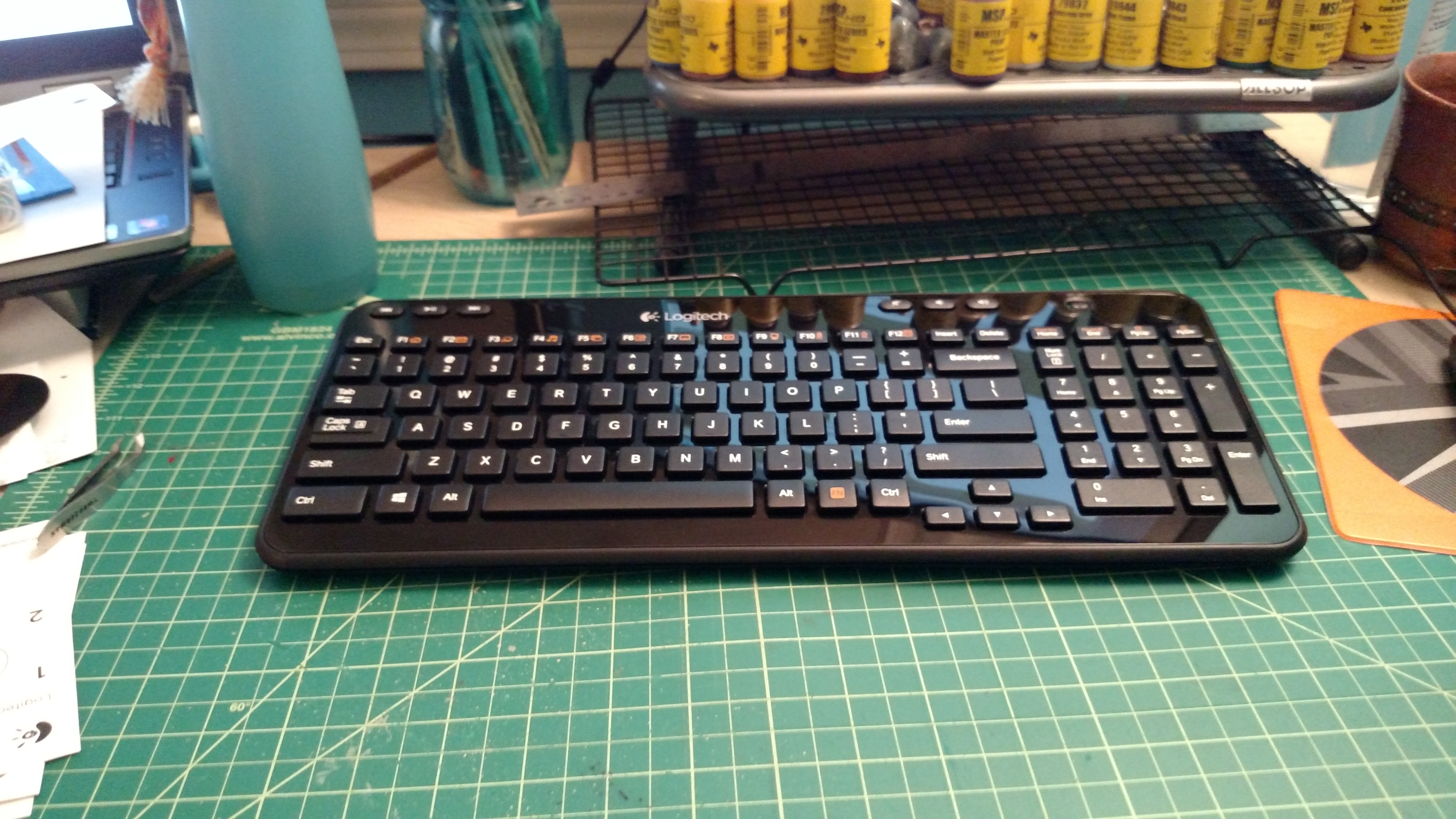 I looked at my options, most of which were either way too big, way too expensive or just way too much until I found a reasonable shaped and sized wireless keyboard. It’s not quite full sized, which currently is a little bit of a pain, but it does have a full number pad which is important to me. Also it has chiclet keys like a laptop, which means that the larger pieces of dirt and such won’t get stuck in it. But more so, being smaller and wireless, I can put it away when I’m not using it!
