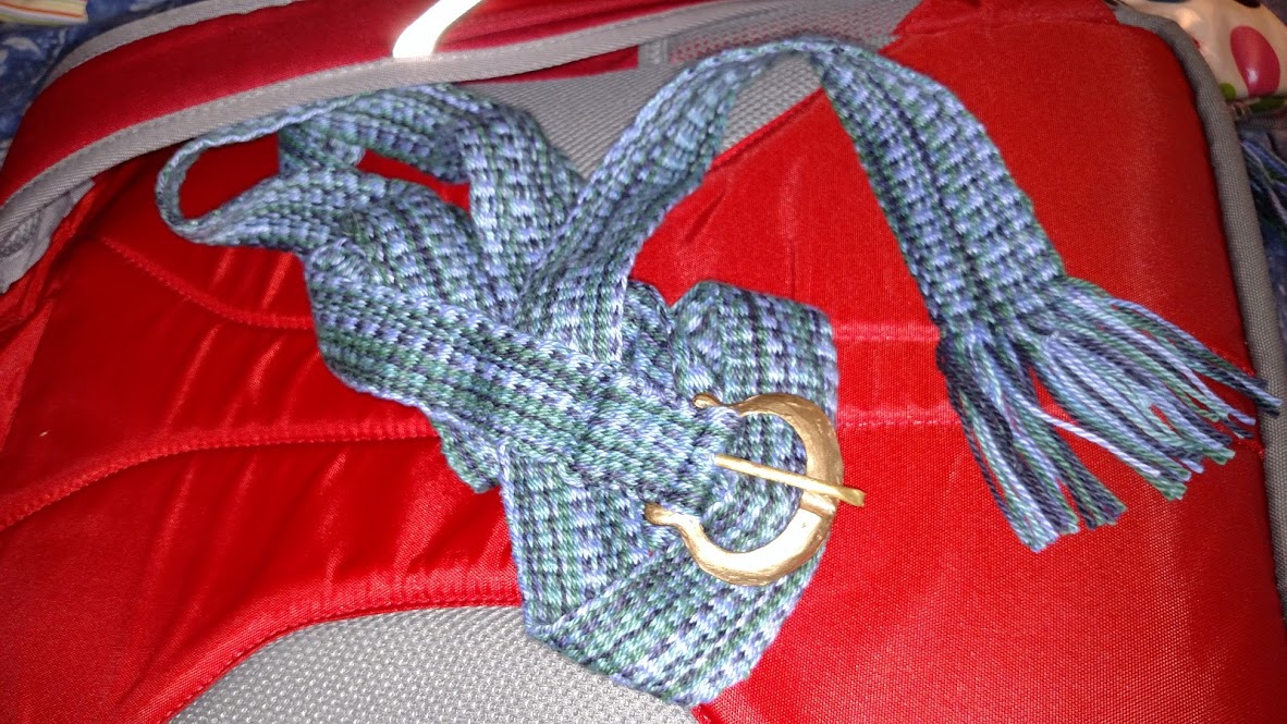 Total time to make the belt – well I bought the yarn on Wednesday night, didn’t start working on the belt until after teaching my class and hanging out with Beth, so Thursday evening until I ran out of light and then Friday when we weren’t disassembling the camp, I was working on this. I finished weaving it when we ran out of light on Friday. I sewed on the metal bit when I got home.