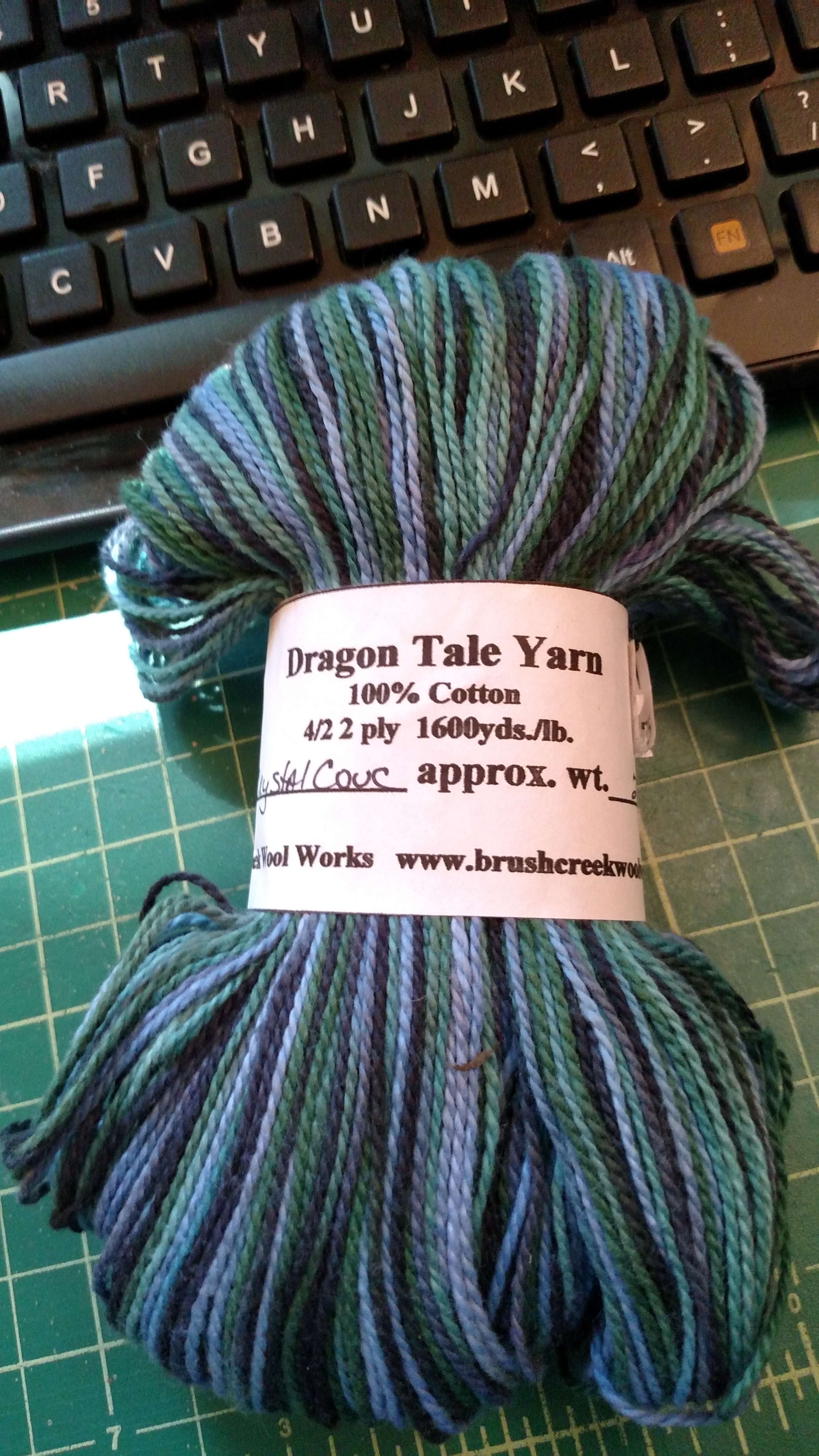 The yarn is cotton Dragon Tale Yarn. 4/2 2ply 1600yds/lb Crystal Couc? – 2 ounces from my favorite vendor at Pennsic: http://www.brushcreekwoolworks.com/ As I said to them this year, if I were to merchant, this would be my shop as it has nearly everything I love.