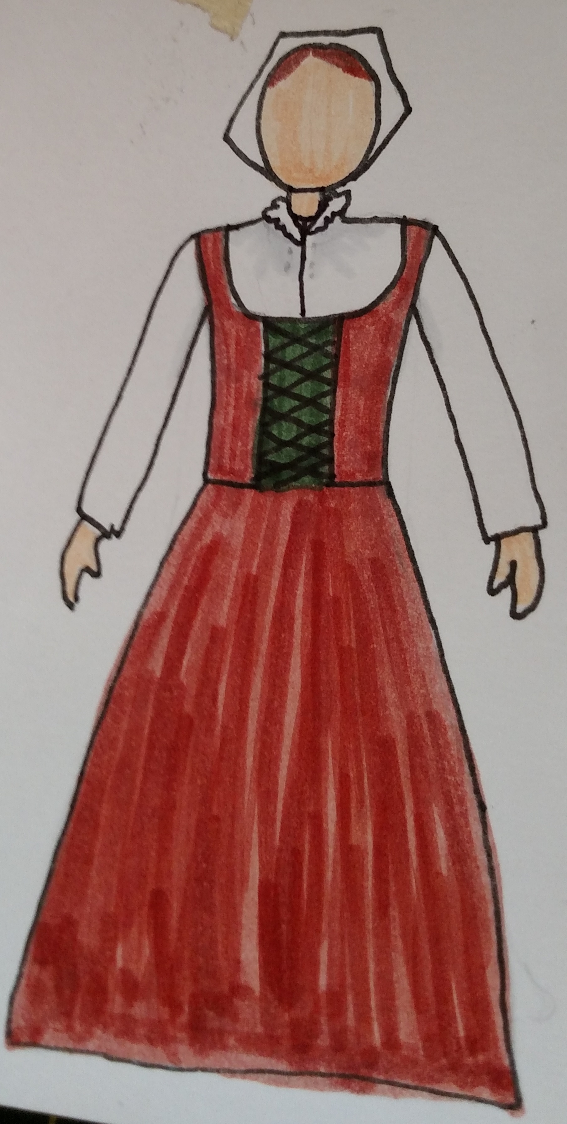 Step 4) Sleeves! Doubletly thing! No idea what is going on with that belt, or where the partlet went to, or precisely what that hat is, but it’s based on the coif/forehead cloth thingy.