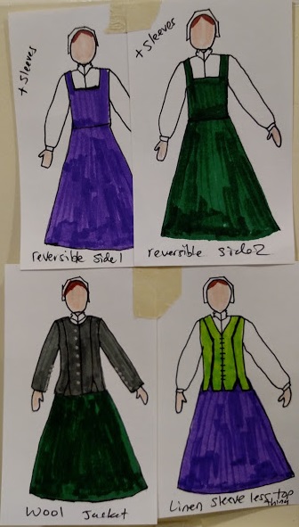 The gray lacing overdress is an interesting experiment that will dress up the reversible dress, and can be decorated with trim. I’ll also need an apron. Or two.