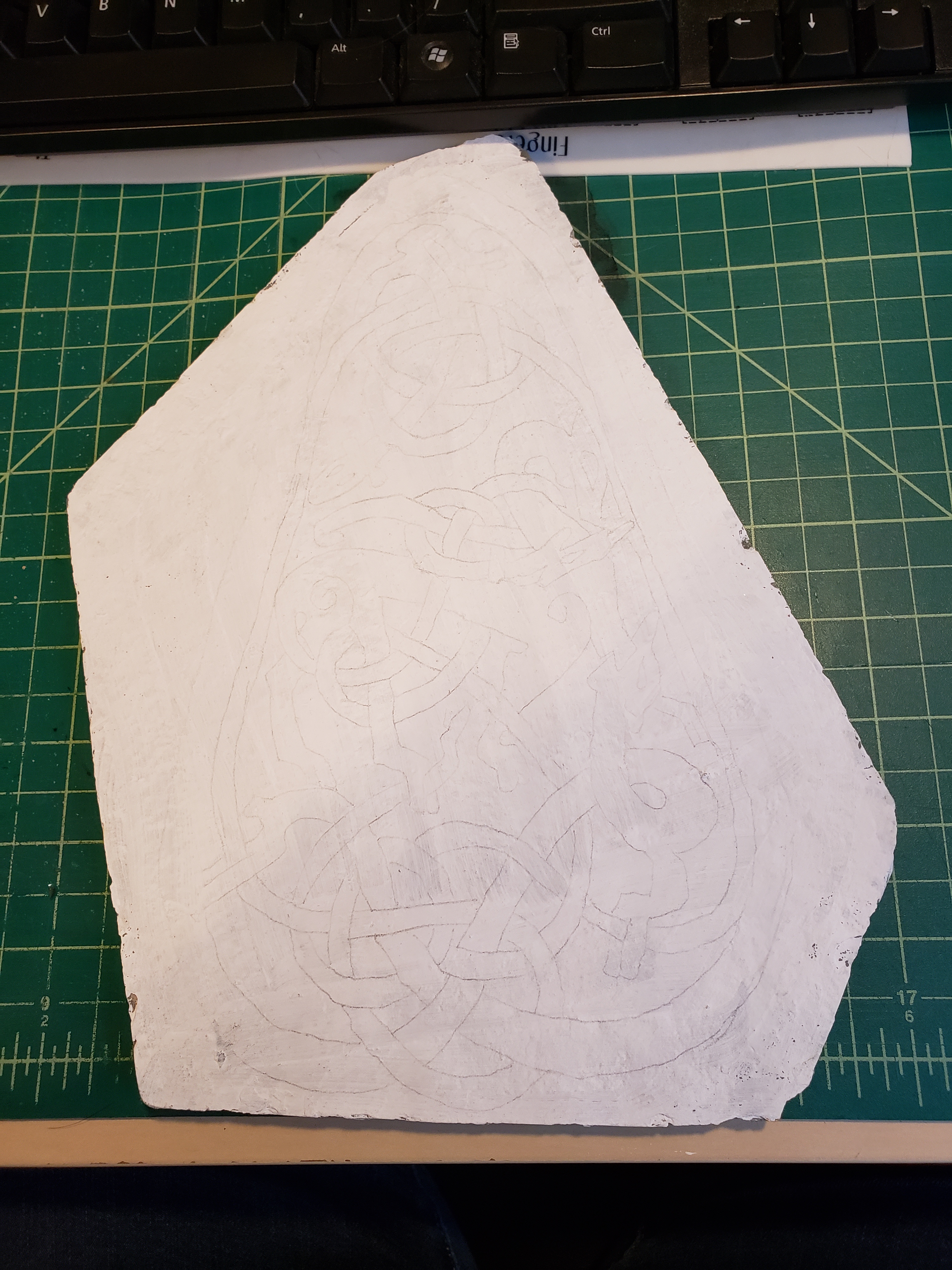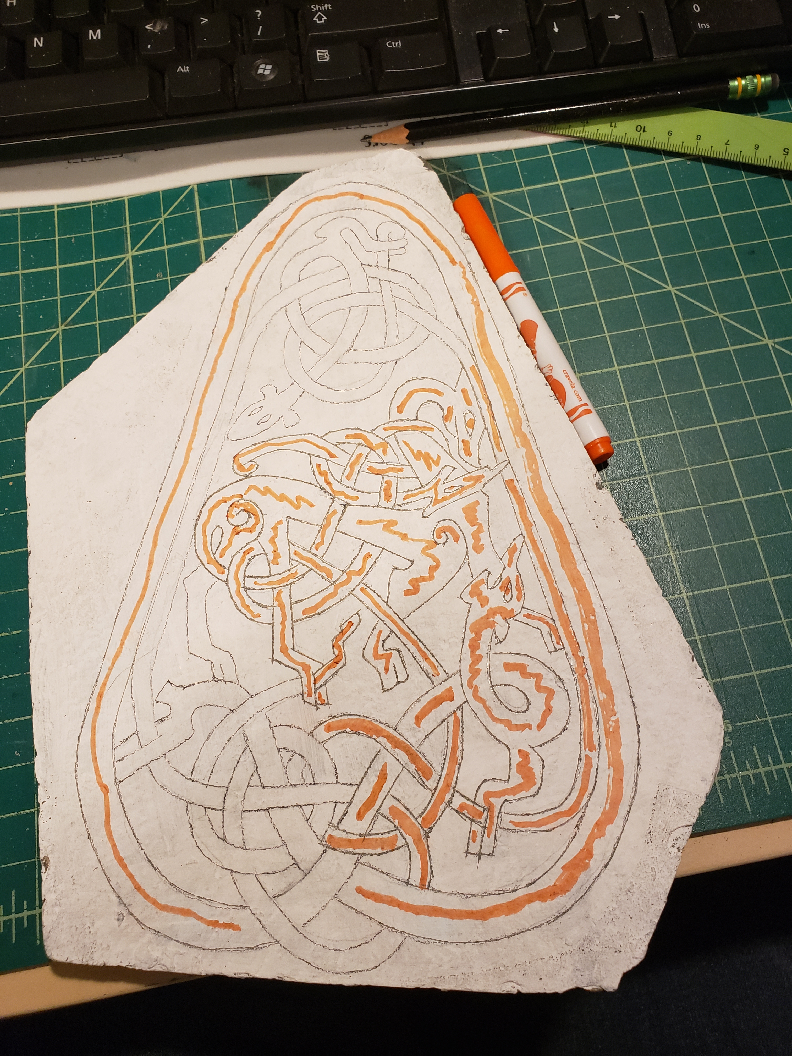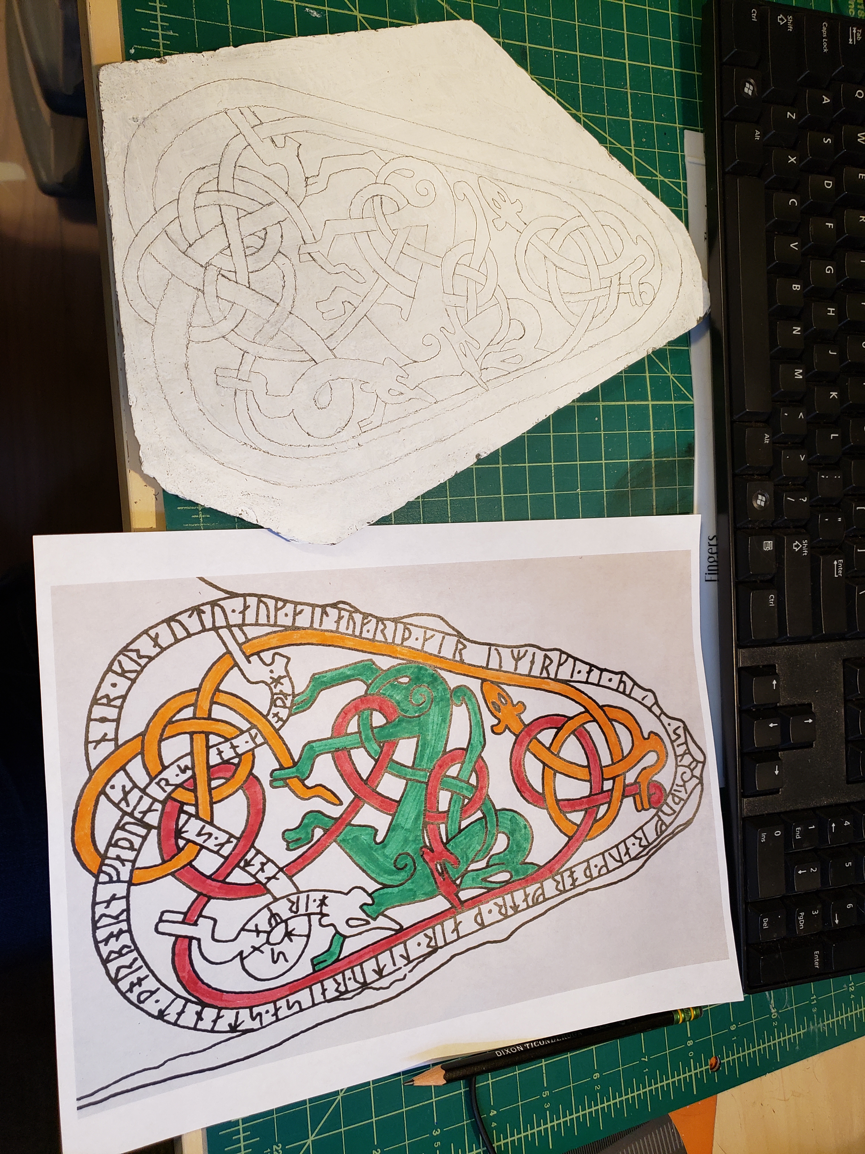 Then I started researching which design I wanted to put on the stone. My initial goal was a man fighting monsters, but the people on these stones are pretty strange looking and few and far between, so I had to go with creatures fighting creatures. While browsing through “Viking Designs” I found one that matched what I was looking for: