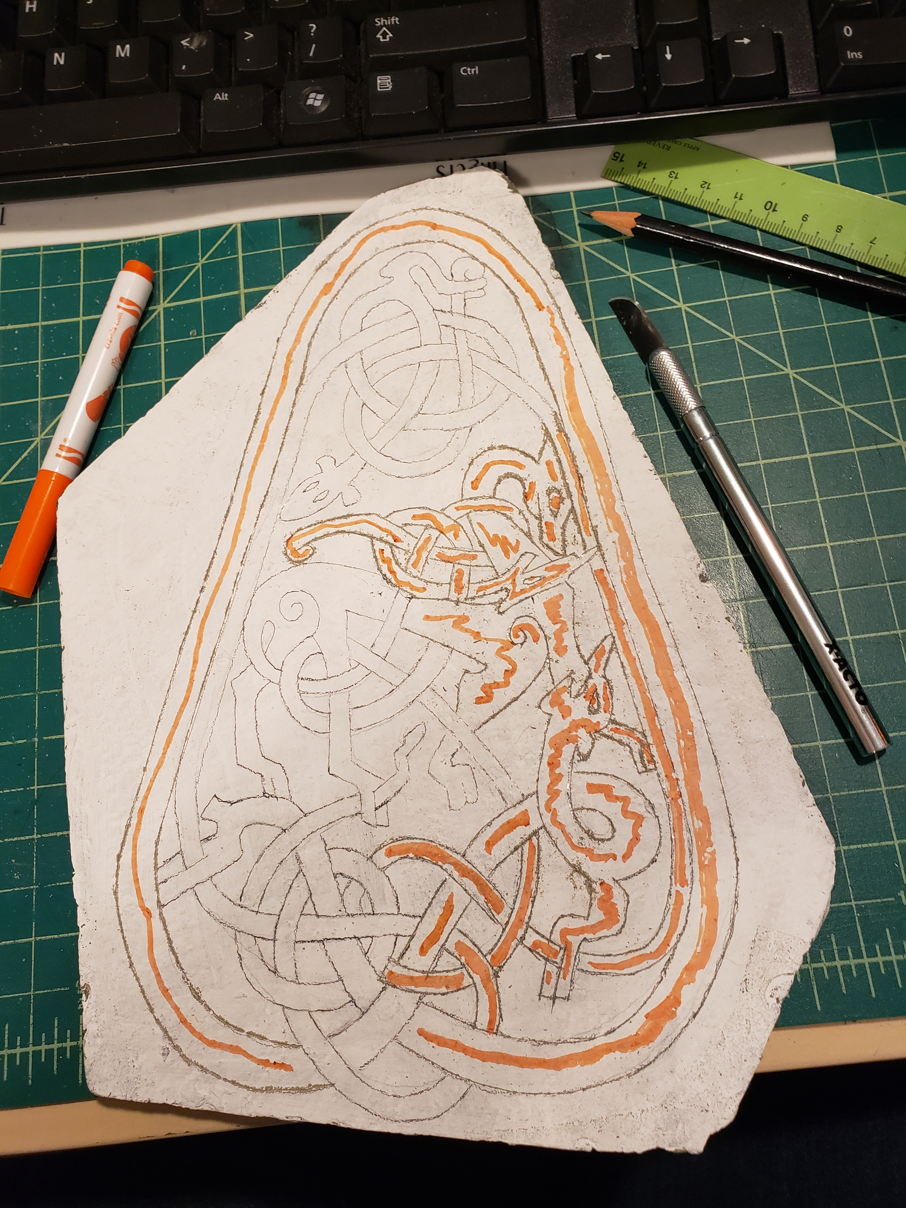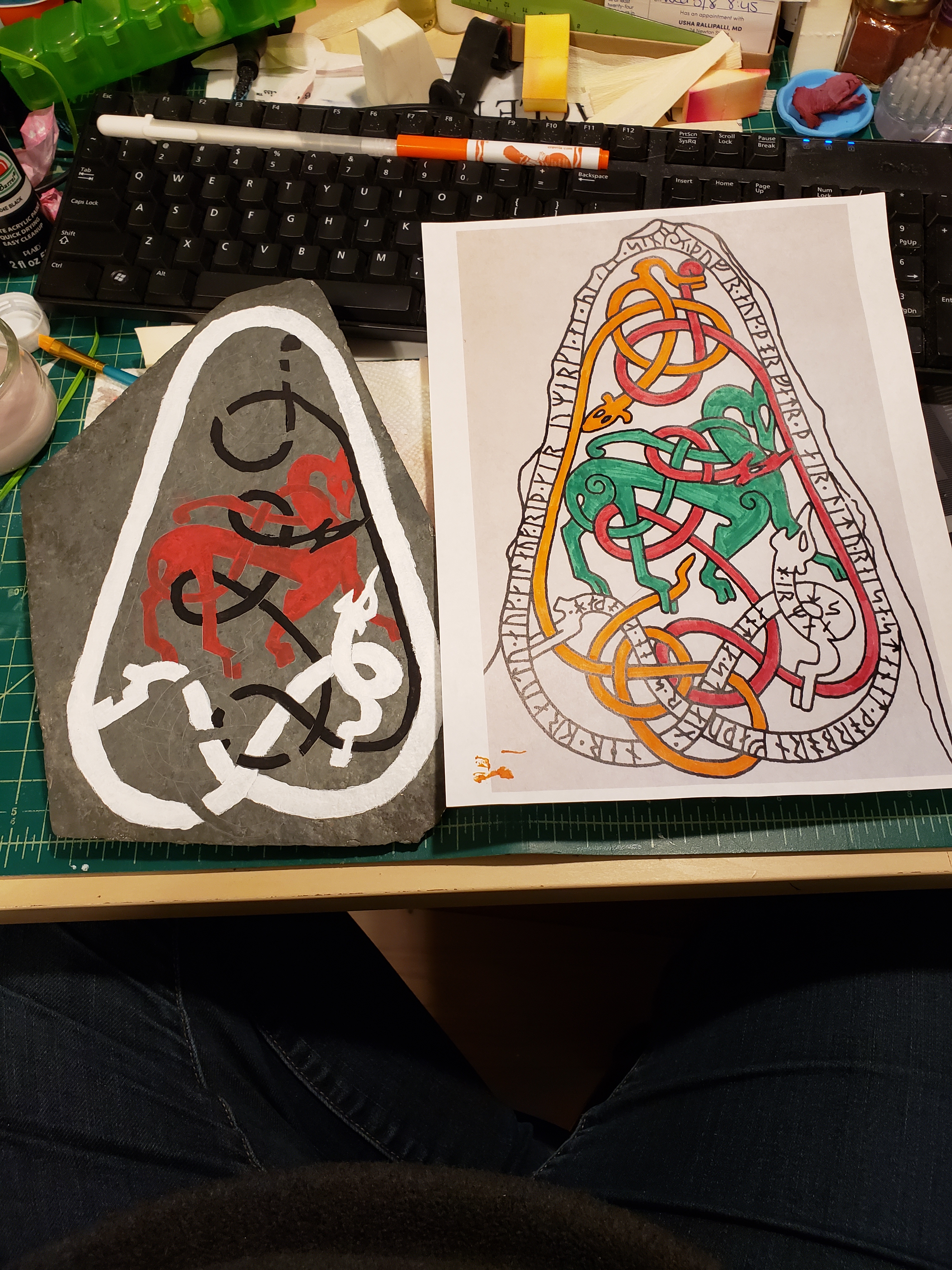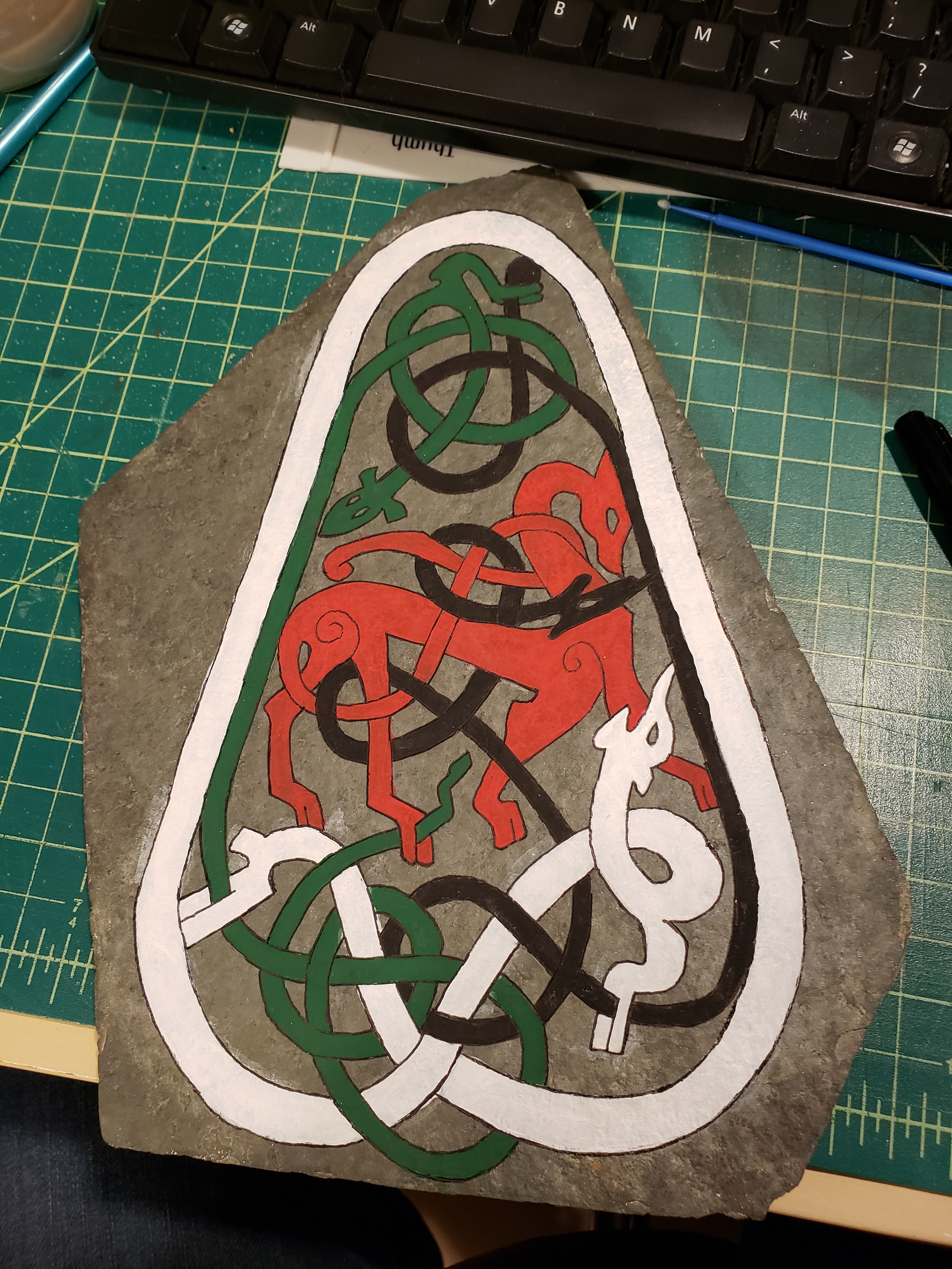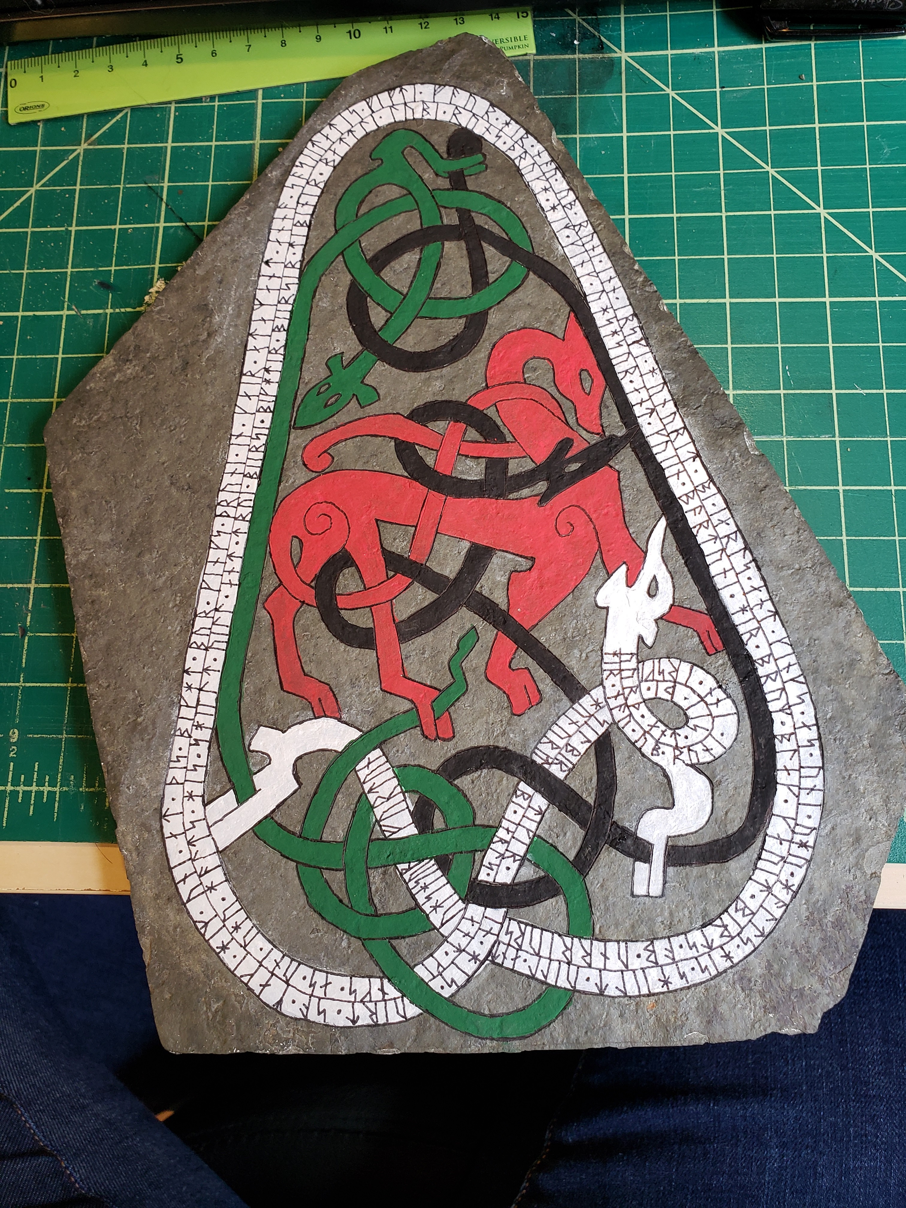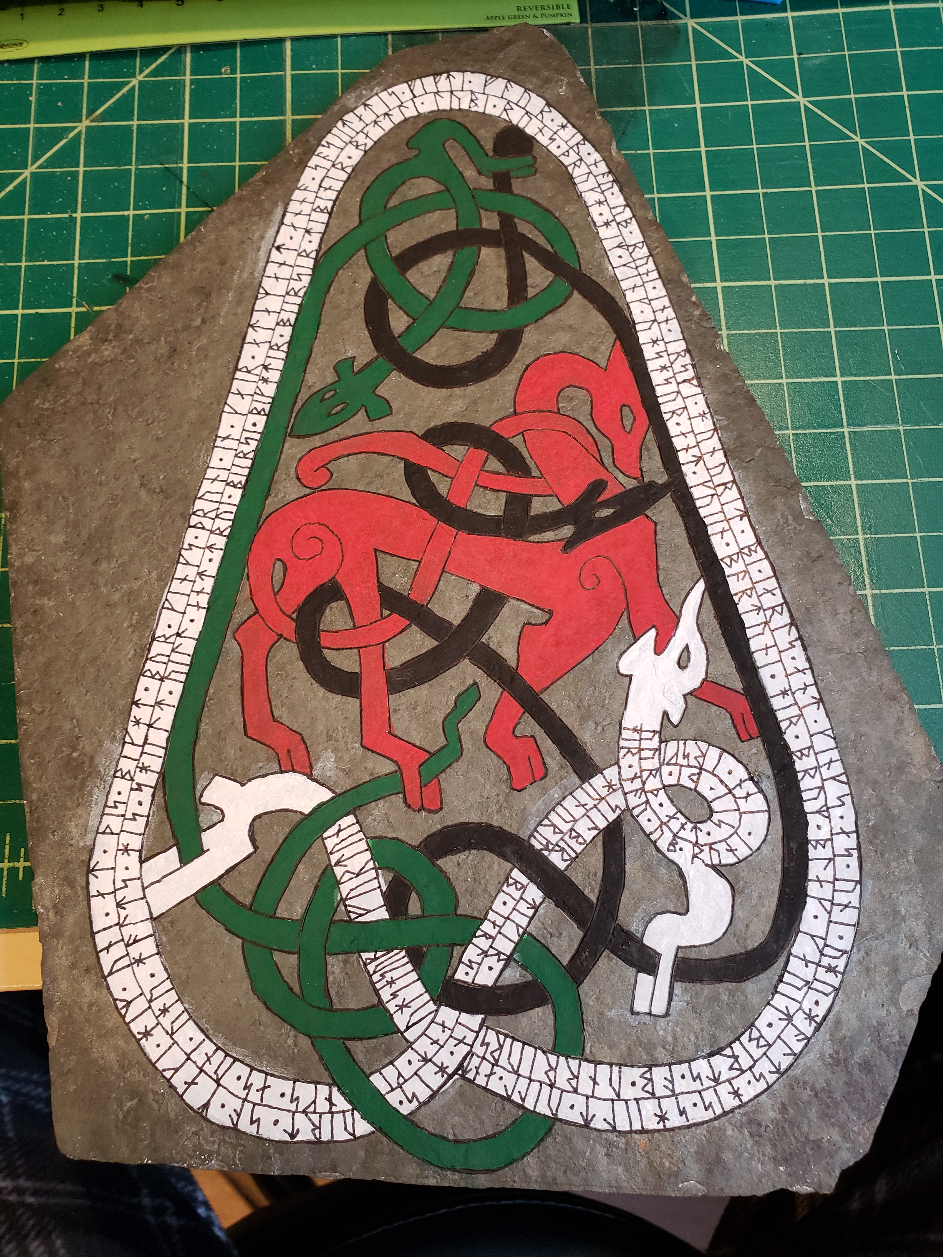 So I painted the stone white, and transferred the design using homemade carbon paper, this didn’t leave dark enough lines, so I went back over all the lines with a pencil. I then inscribed the lines on the stone using a knife. It was difficult to see which lines I had already inscribed, so I used an orange marker to keep track. Once all the lines were done, I washed the stone with soap and water. While waiting for it to dry, I tested the colors I had to see which would look best on the different lines. The colors were chosen as they are similar to colors that the original artists would have had access to, and what has been found in archaeological investigations of the stones. I transliterated the text from English characters into Younger Futhark Runes and wrote it onto the stone in two lines, since there were many more characters than would fit in one line. I cleaned up the edges with a pointed q-tip and called my courier to come and get it, as I was not going to the event this time.